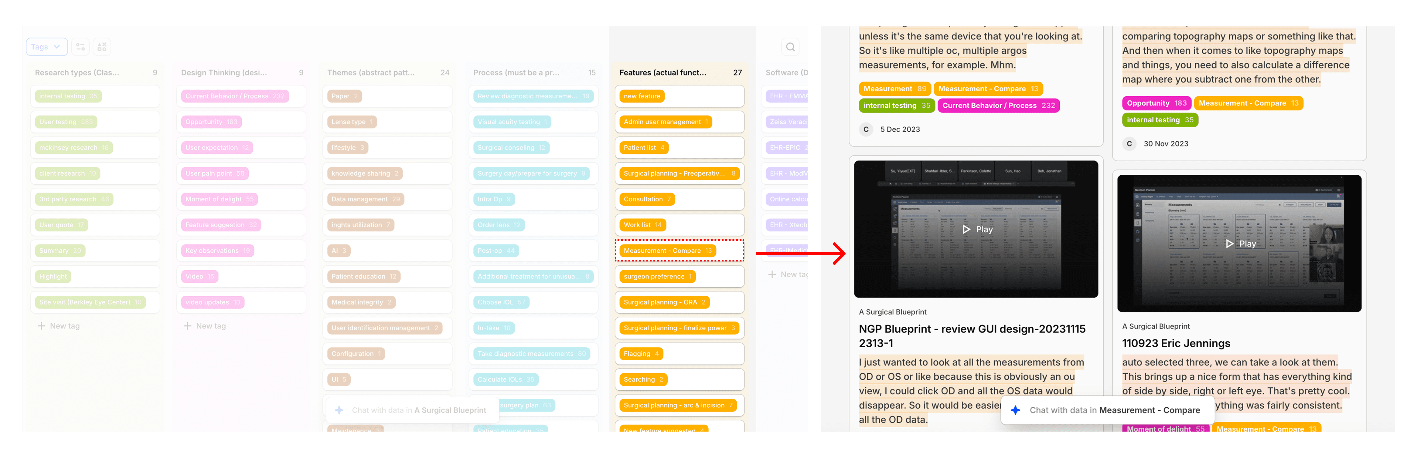 I established a centralized Dovetail repository as the backbone of the project. While AI-assisted synthesis can accelerate research, this product demanded depth over abstraction. Small details—terminology, measurement nuance, device differences—directly impacted safety and usability.
