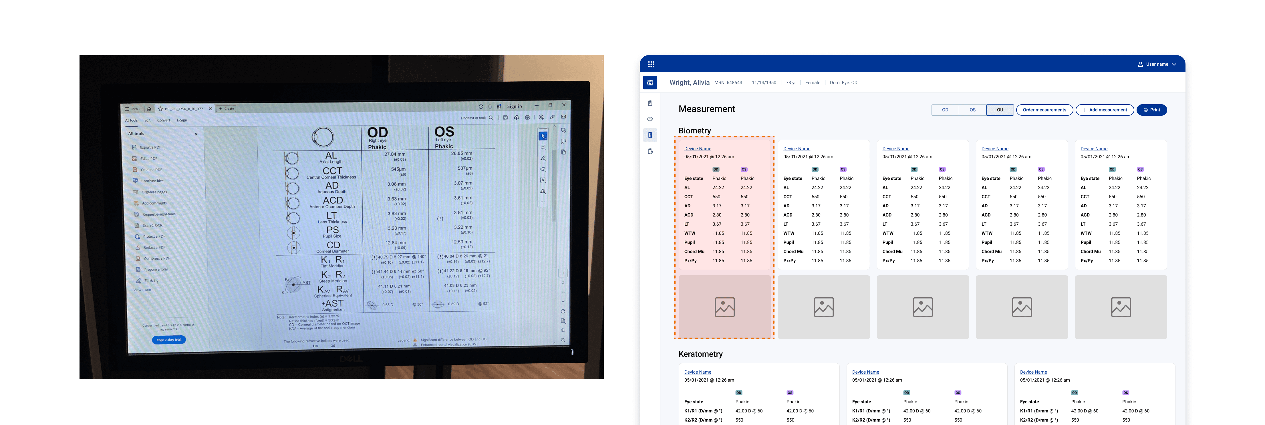 To anchor the experience in existing workflows, I began by translating the printed outputs from each physical measurement device into digital measurement cards. Each card mirrored the device printout, showing OD and OS values alongside relevant imagery
