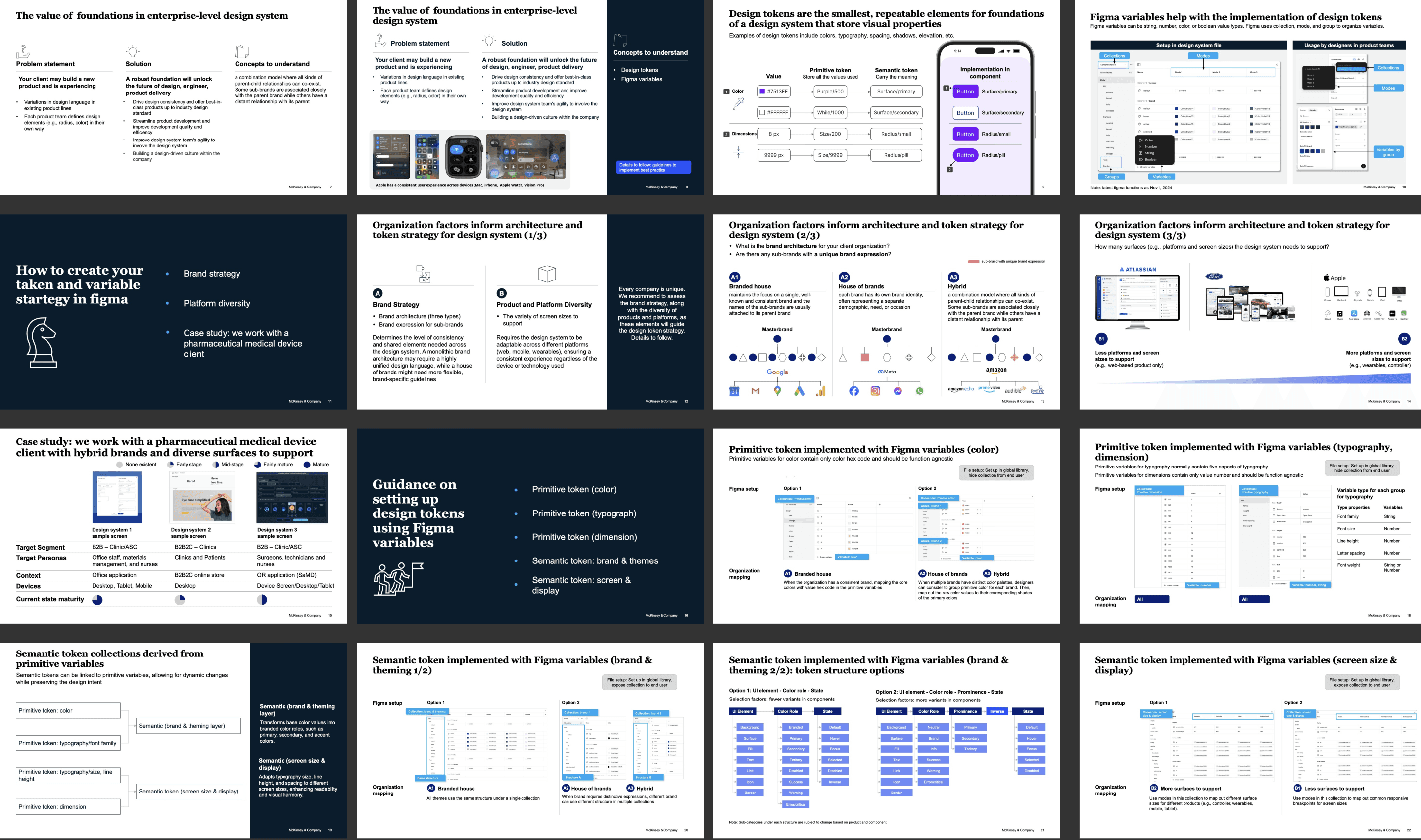 In parallel with the product work, I led the strategy for building the foundation for an enterprise-level design system across a highly fragmented ecosystem. The client operated multiple design systems at varying levels of maturity, supporting hybrid brands and a wide range of product surfaces. I established a scalable foundation by defining a token architecture aligned to brand hierarchy and surface-specific needs, enabling consistency without sacrificing flexibility. I then codified this approach into a playbook—How to Harmonize Design System Foundations—so any McKinsey teams could apply the framework to other clients facing similar problems.