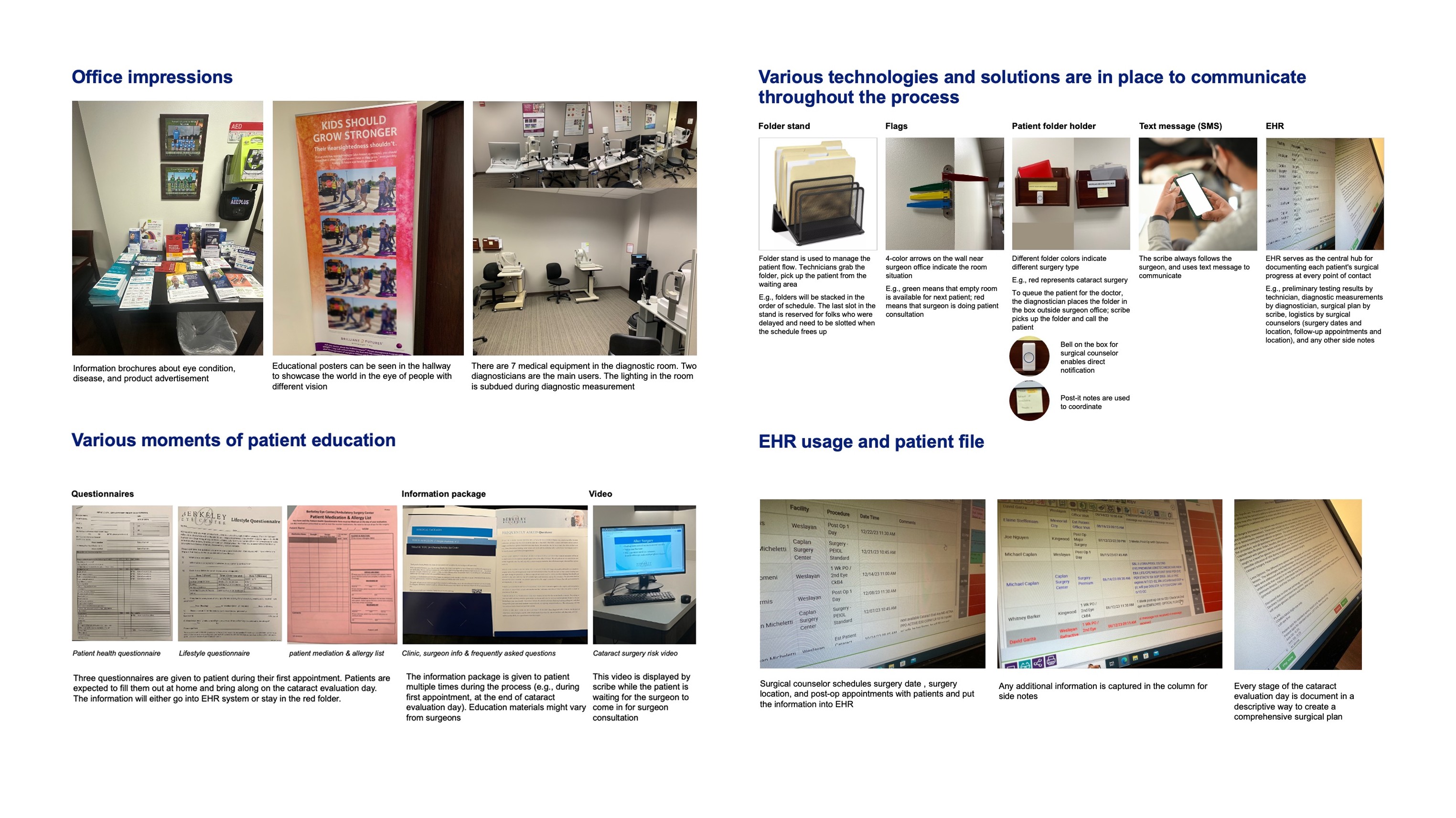 Insight: technicians and surgeons relied on informal visual cues (e.g., color-coded folders, wall markings) to coordinate care.